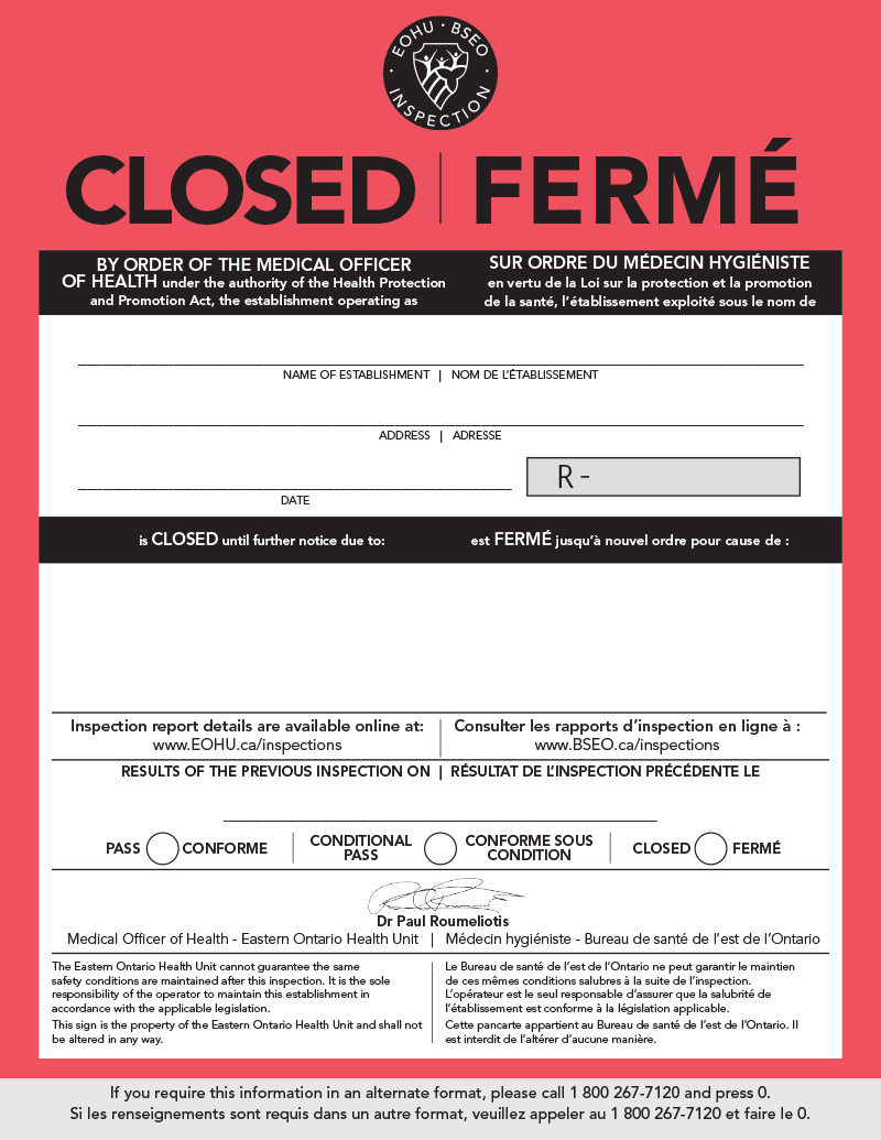 The CLOSED premises will be monitored at all times to ensure that the premises remains closed. The operator may contact the EOHU to request a re-inspection. The operator is responsible for keeping the premises closed. The CLOSED sign will remain posted until a Public Health Inspector issues the appropriate replacement sign based on a follow-up inspection. If the infractions have not been corrected, the CLOSED sign will not be removed, and the premises must remain closed.
