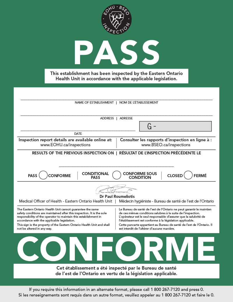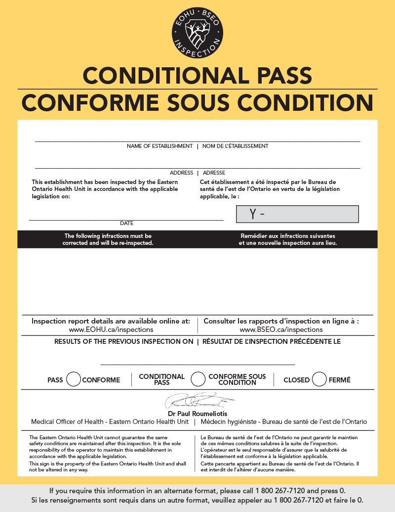 A CONDITIONAL PASS sign will be issued when significant non-compliance with the Ontario Food Premises Regulation (O. Reg. 493/17) is observed during an inspection. To avoid a closure order being issued, immediate threats to food safety must be addressed to the satisfaction of the Public Health Inspector during the inspection. A CONDITIONAL PASS indicates that the premises may not be operating according to the Ontario Food Premises Regulation in between inspections.